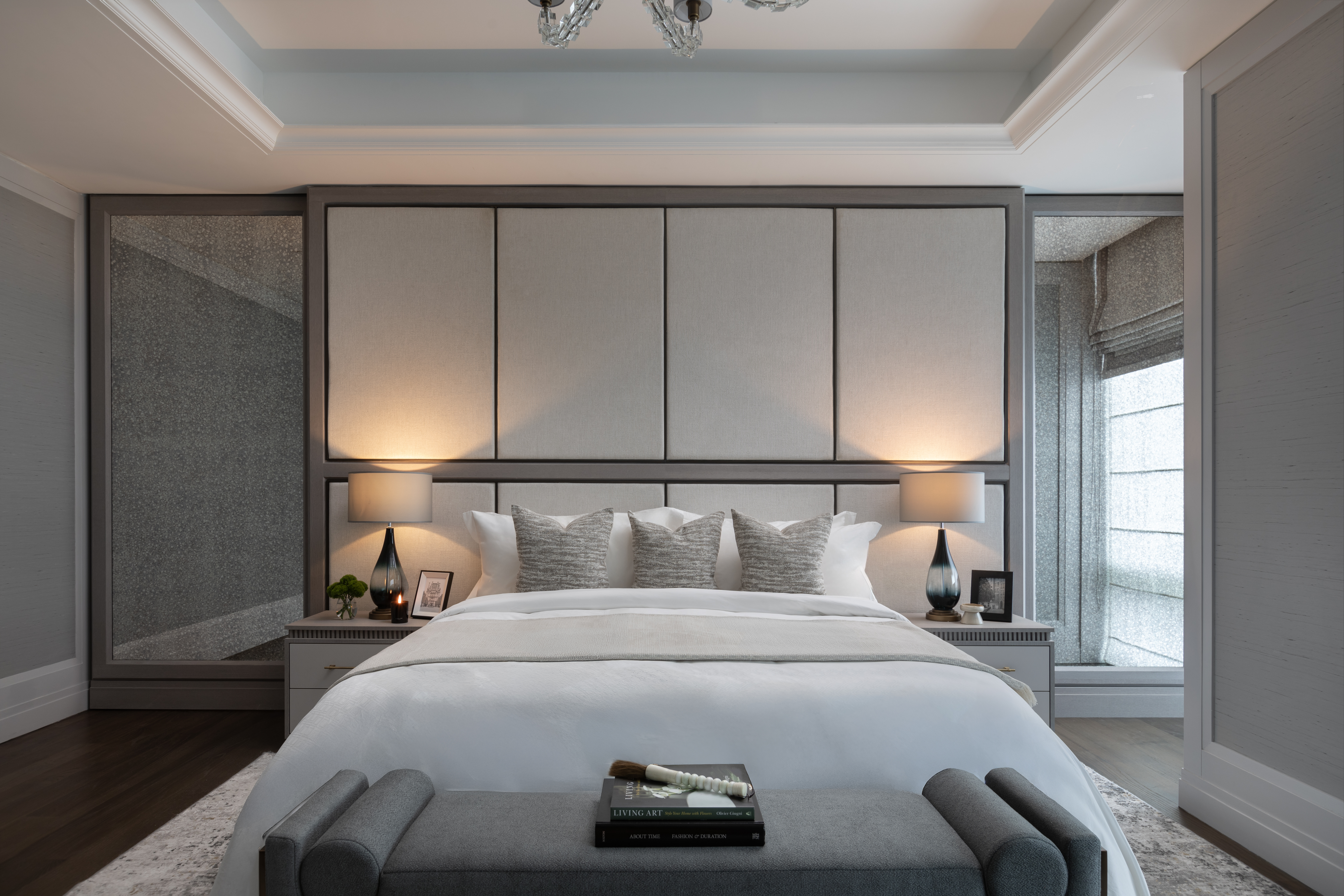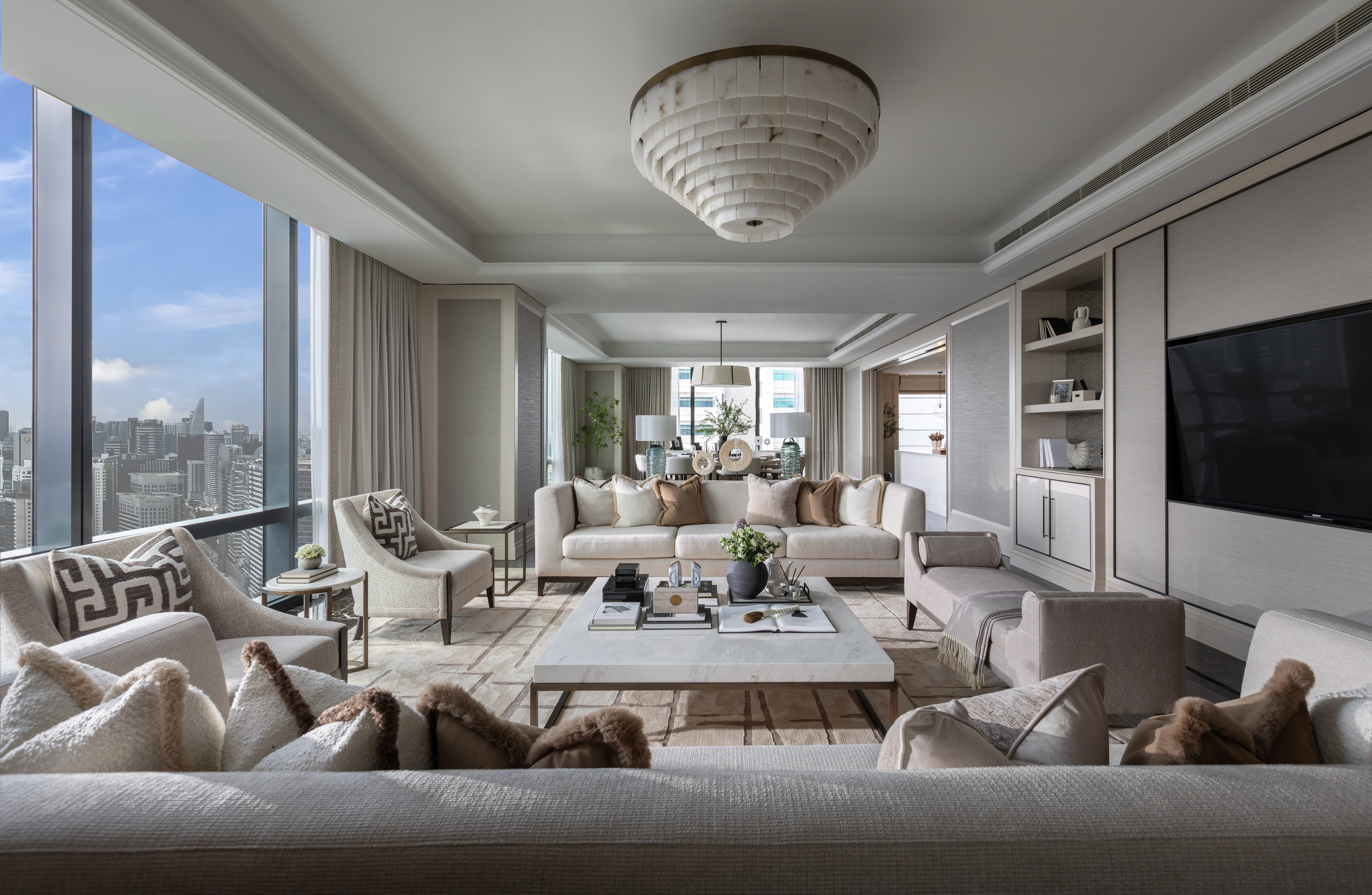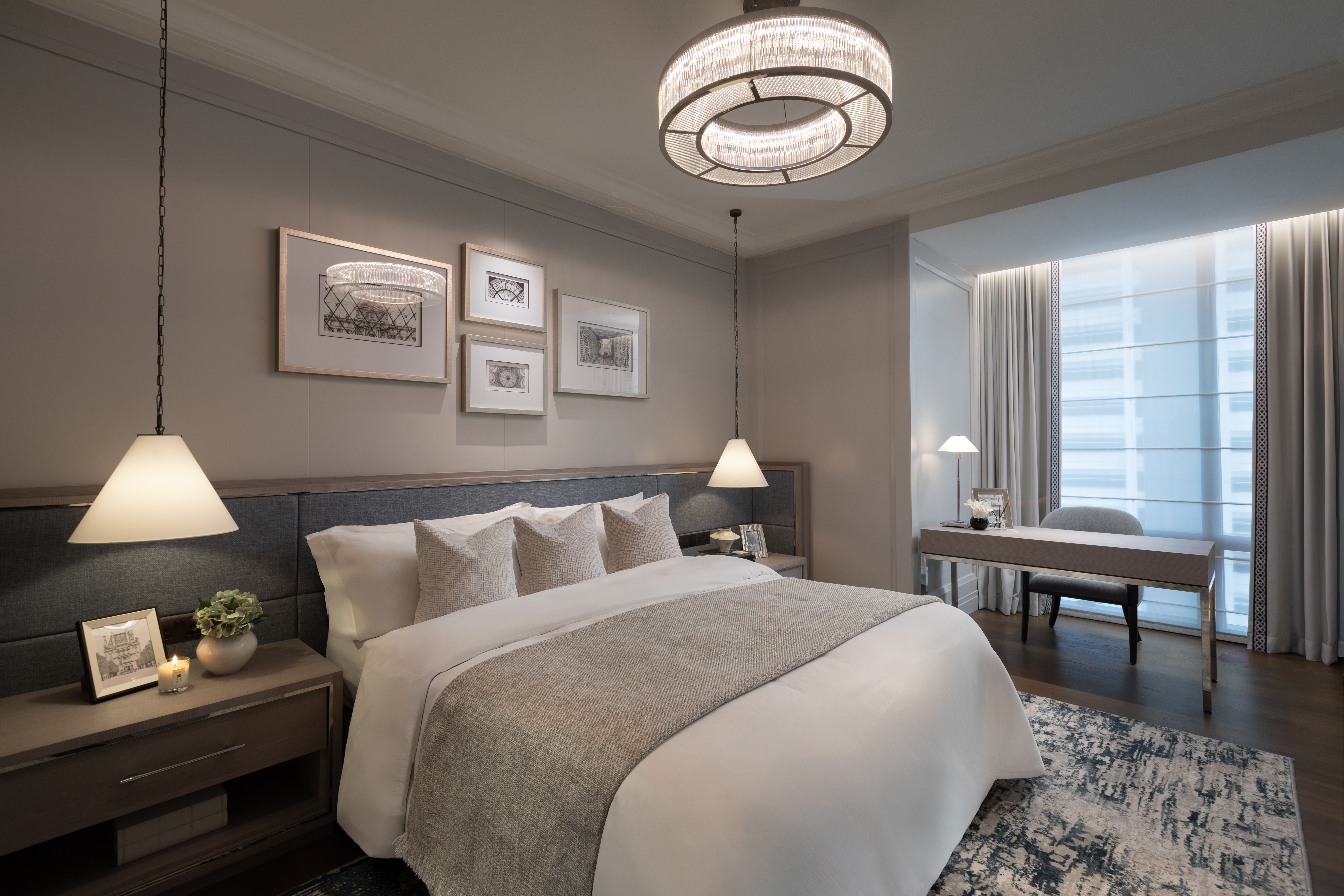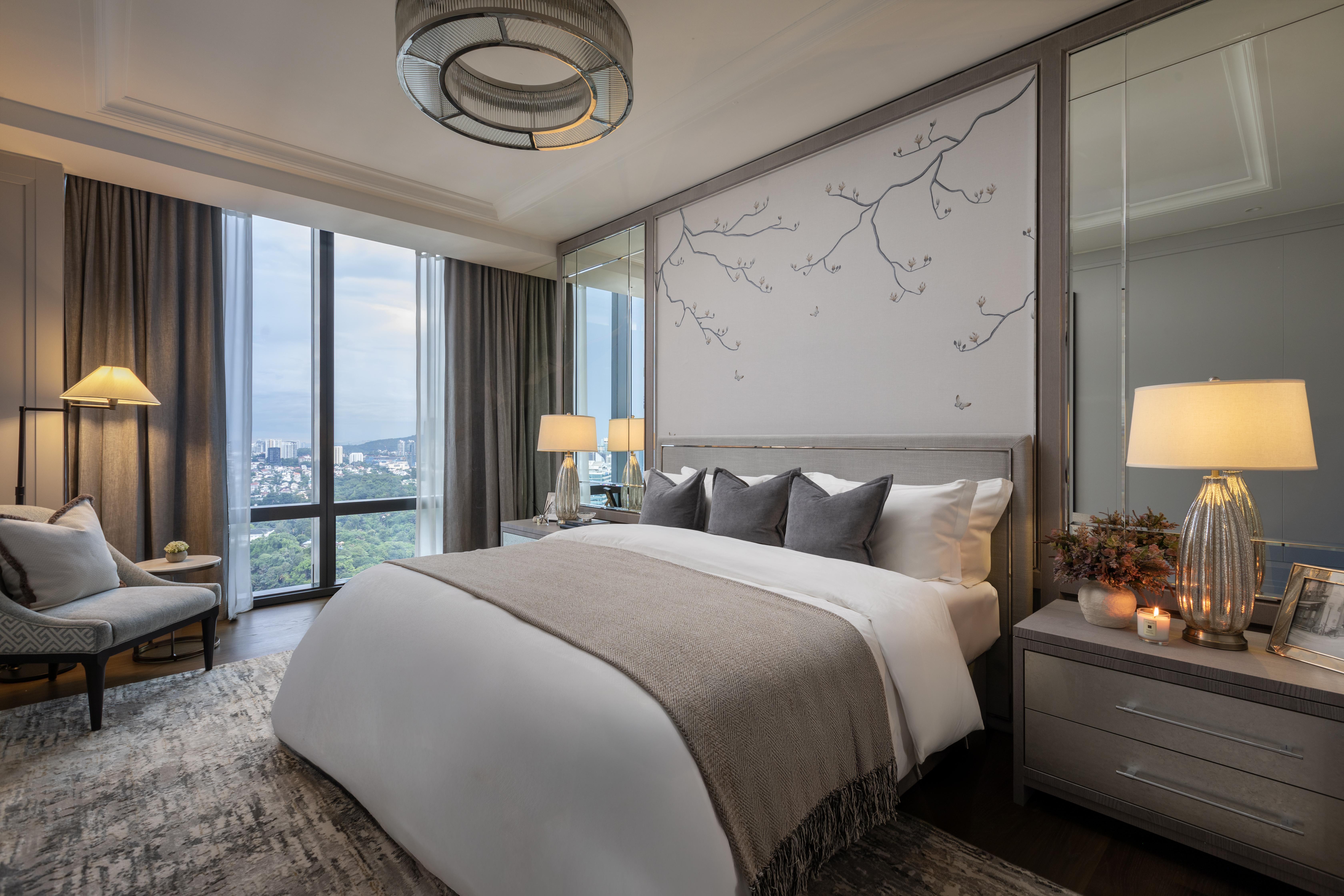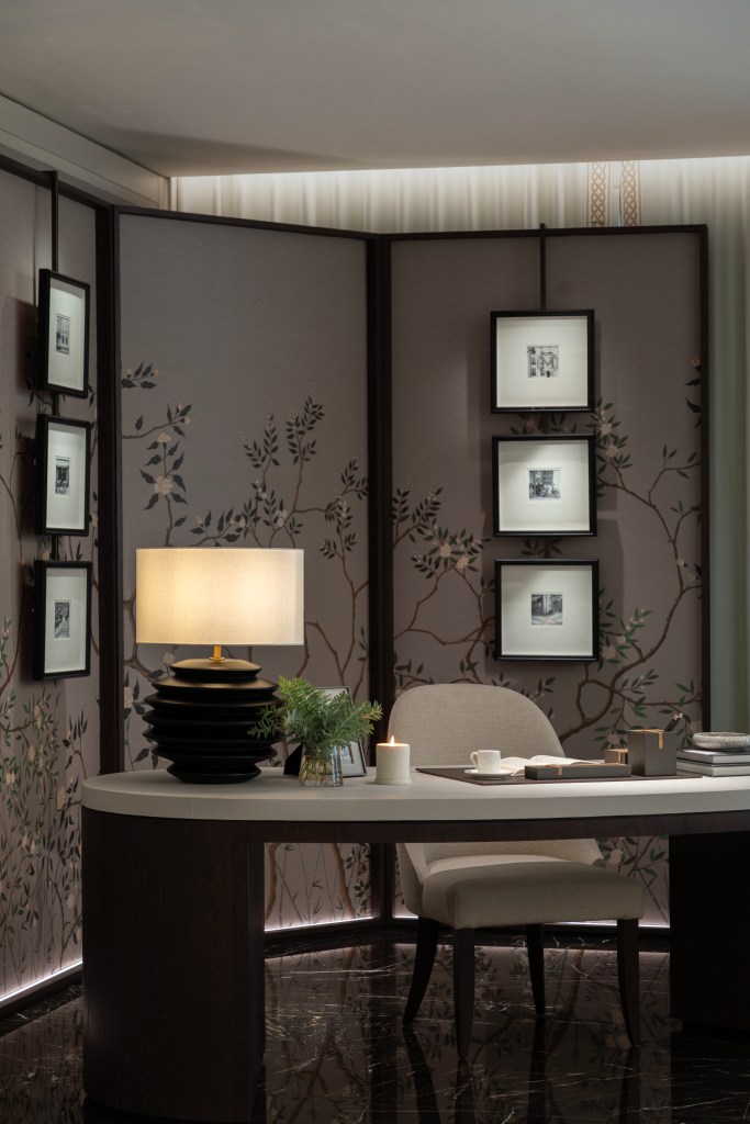 The custom wallpapers serve as statement pieces, enhancing the atmosphere with tailored patterns and textures, while the carefully selected furniture pieces complement and enhance the overall design. The result is a harmonious environment where every detail is crafted to offer both beauty and practicality, creating an exclusive and refined living experience.