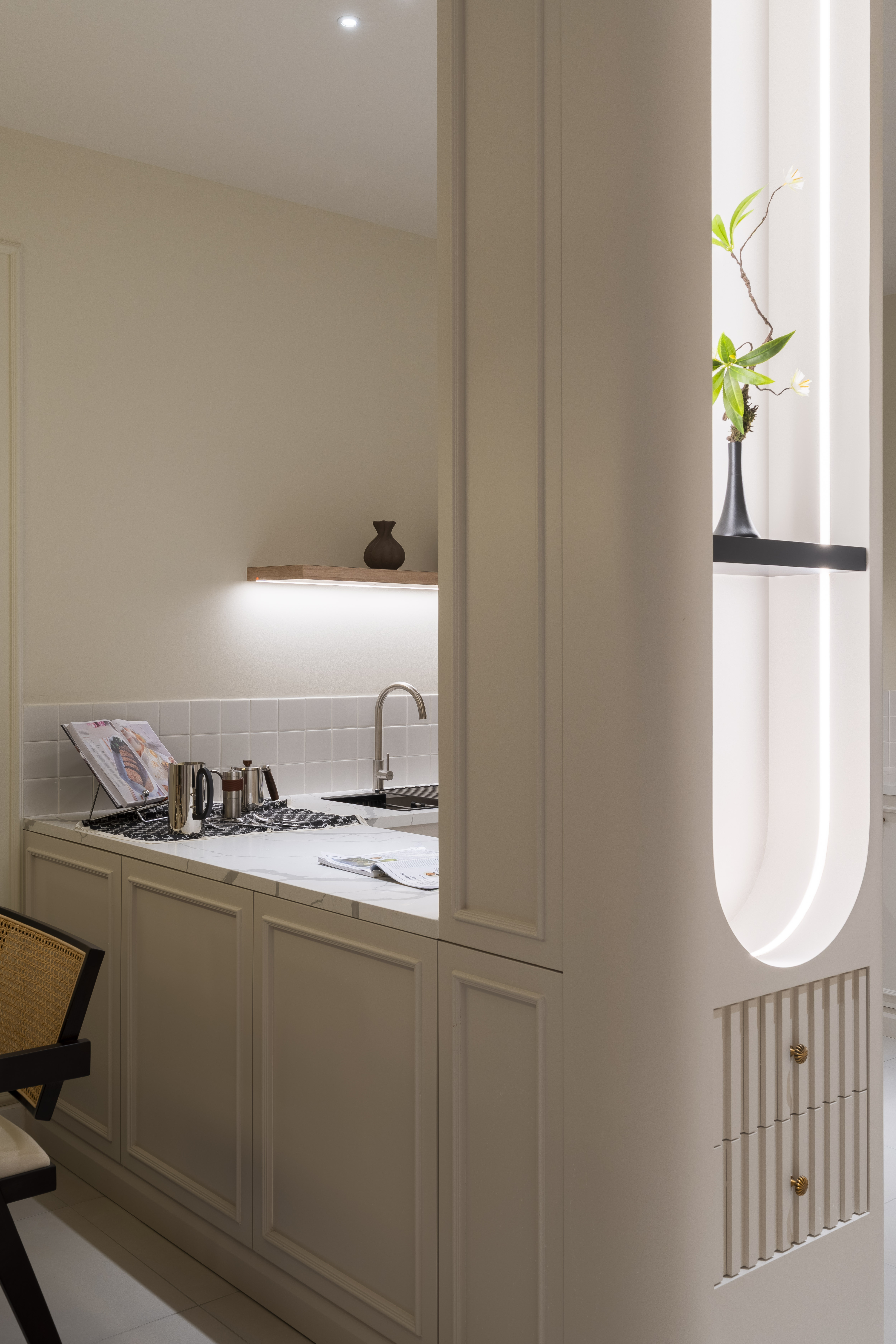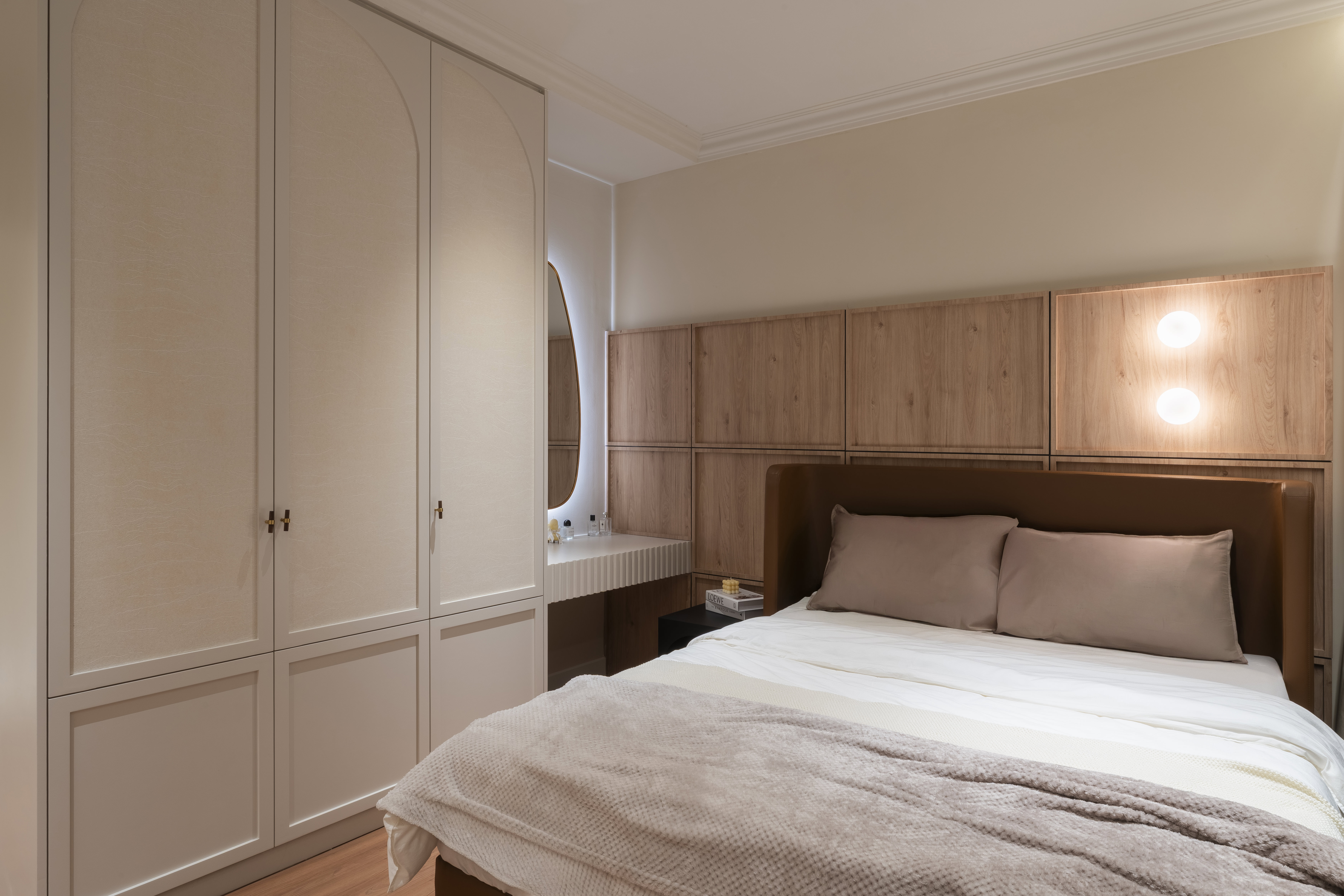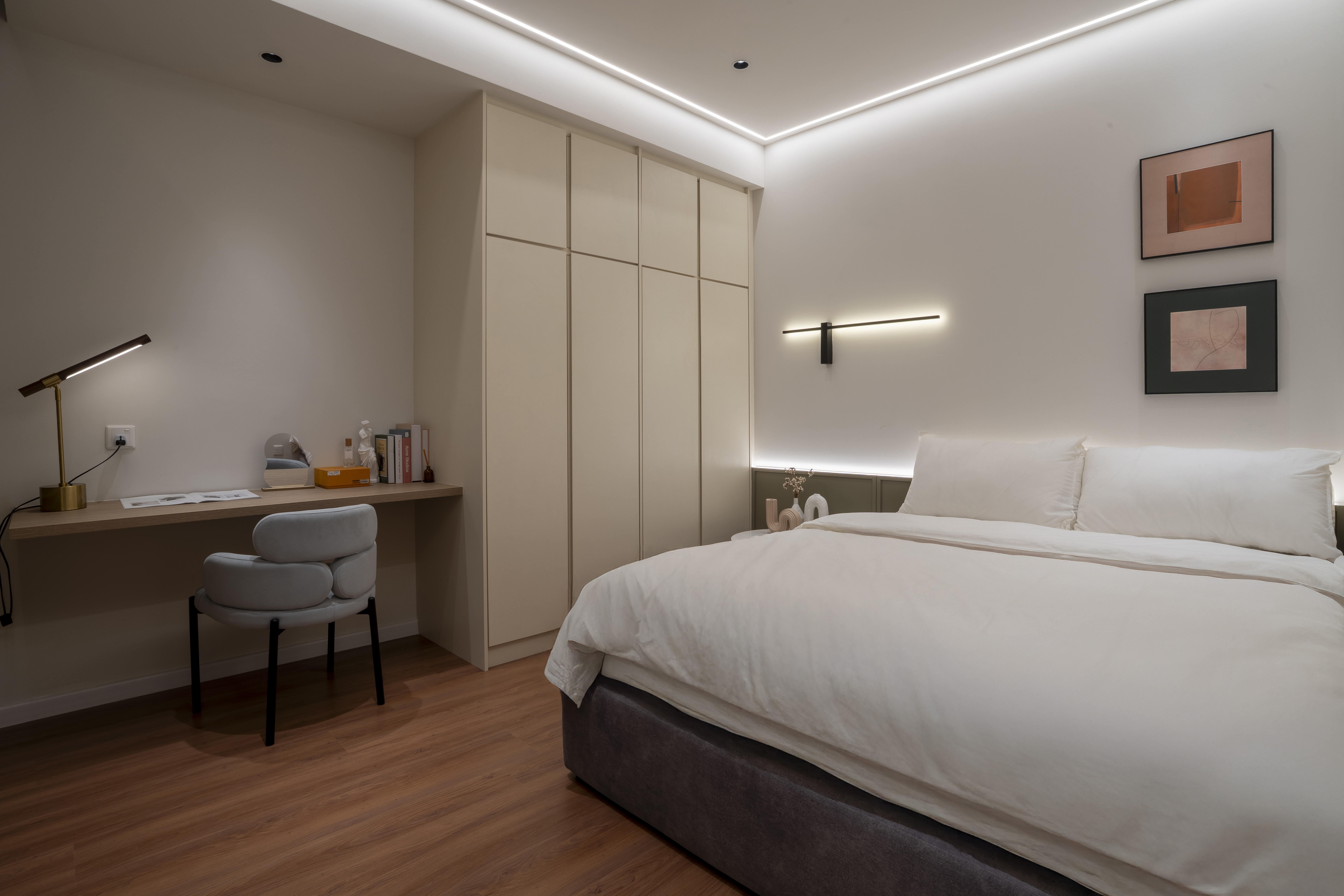 A warm and serene interior where soft neutrals and gentle lighting create an inviting sense of calm and comfort.